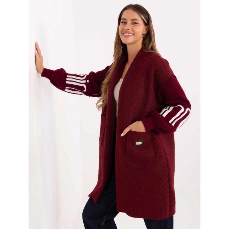 Bordó női kardigán felirattal az ujjakon.