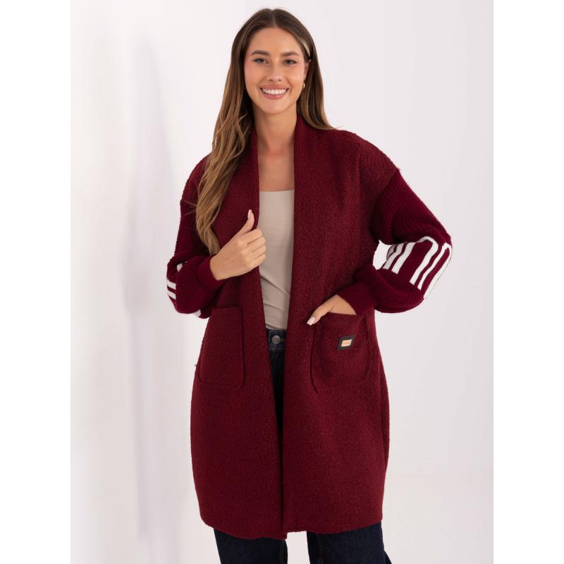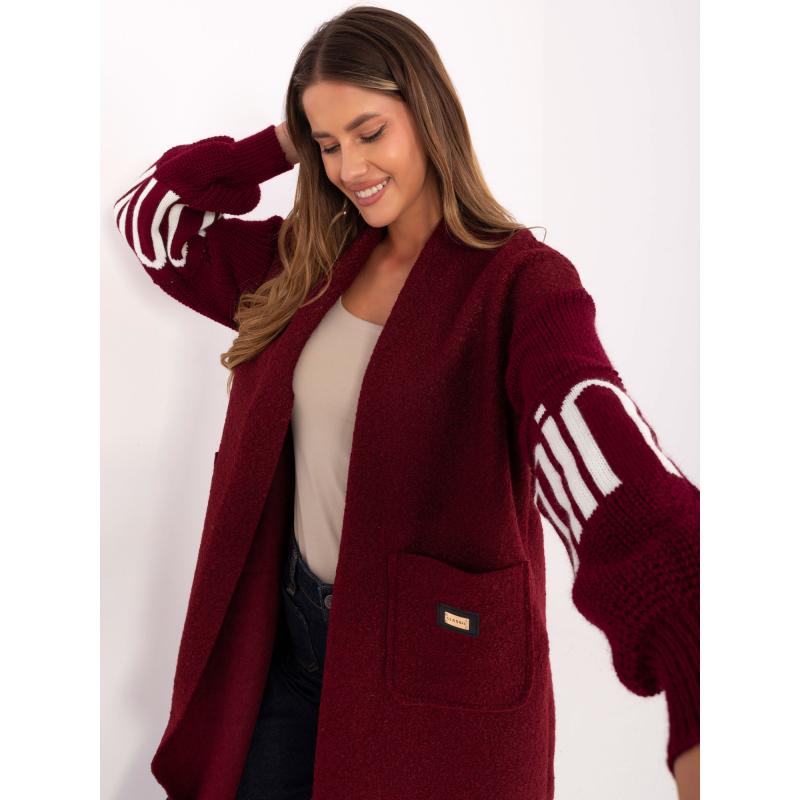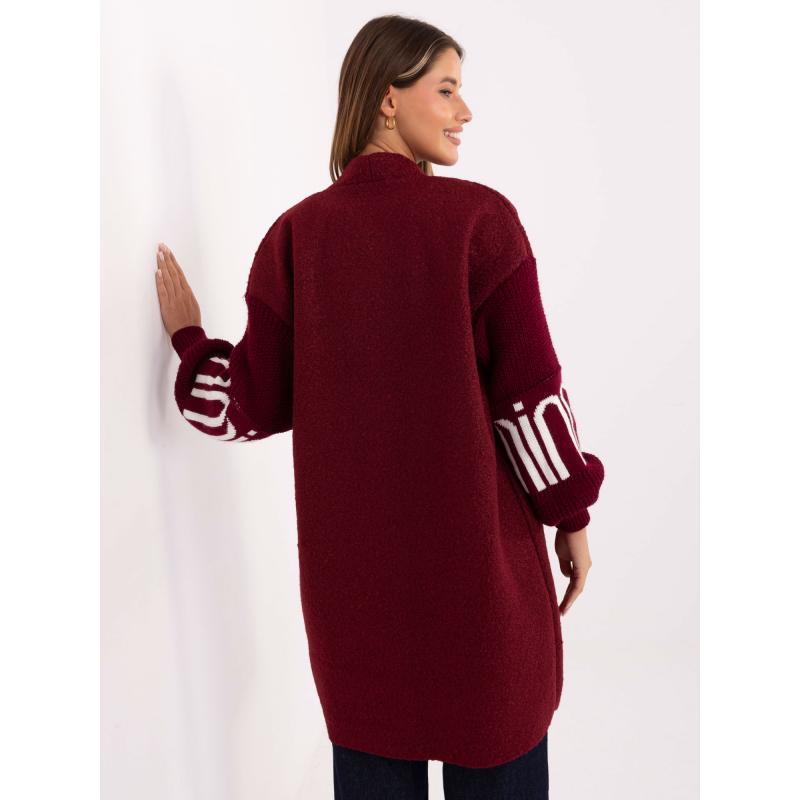Bordový dámský kardigan s nápisy na rukávech.