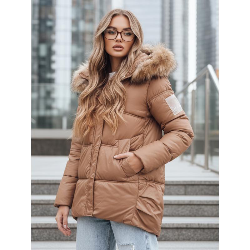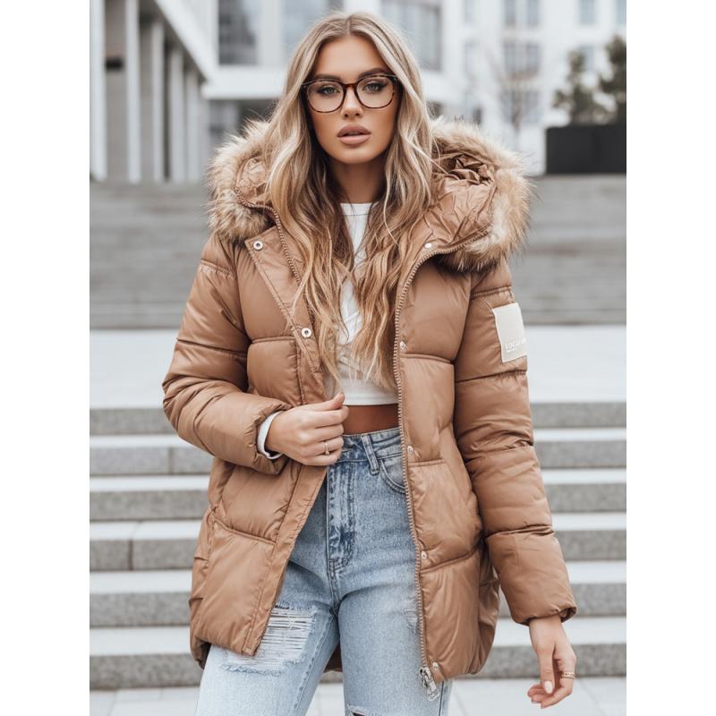 Dámska zimná prešívaná bunda s kapucňou, kamelová