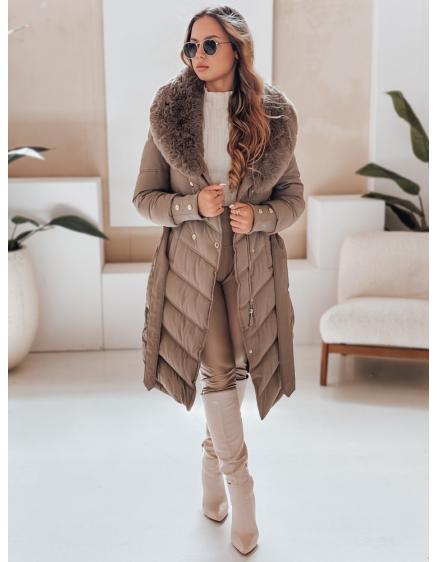 Dámska zimná prešívaná bunda s kožušinovým lemovaním, tmavo béžová