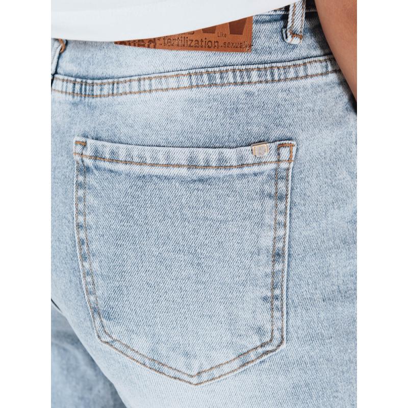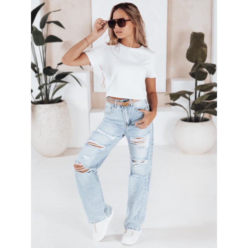 Dámske džínsy so širokými nohavicami a dierami, modré