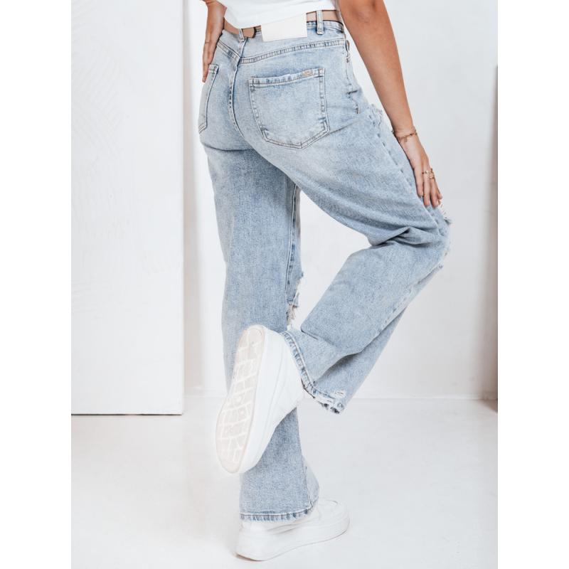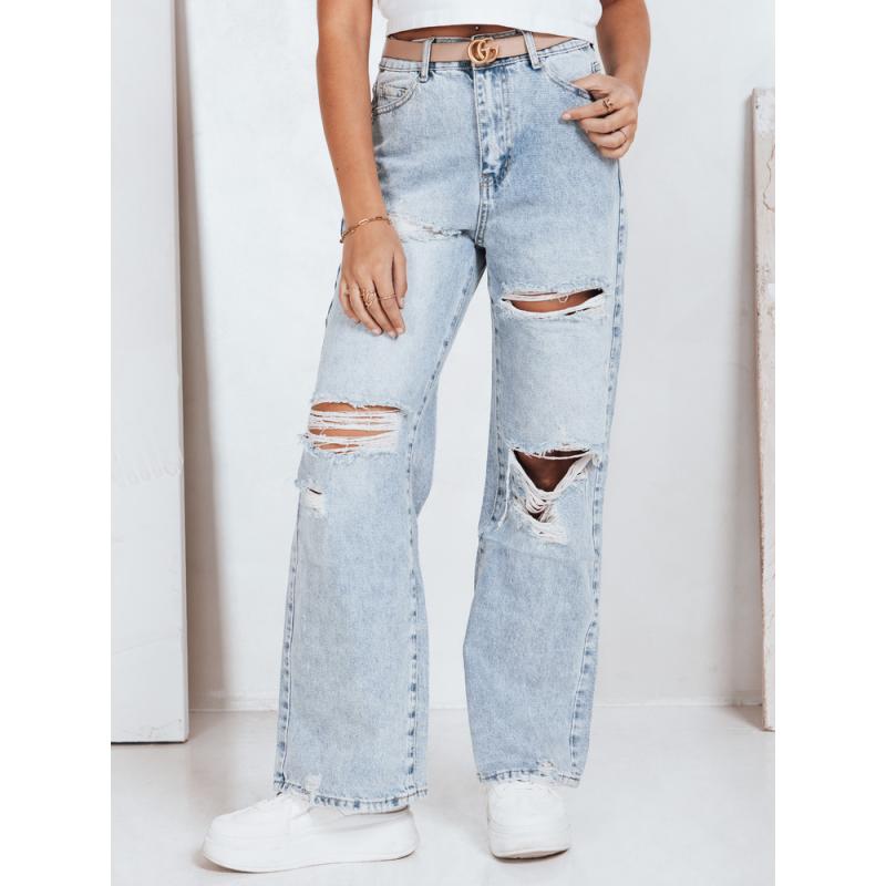 Dámske džínsy so širokými nohavicami a odreninami, modré