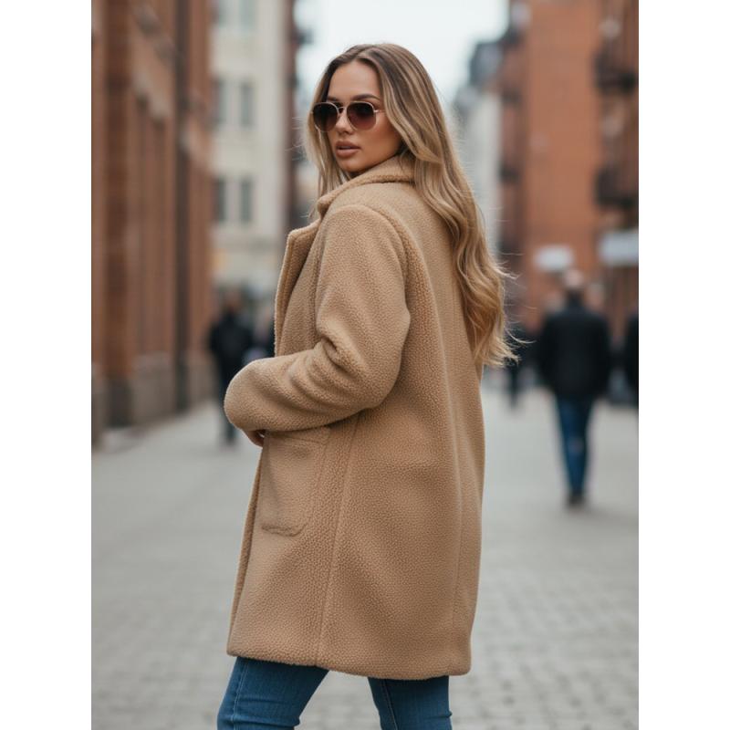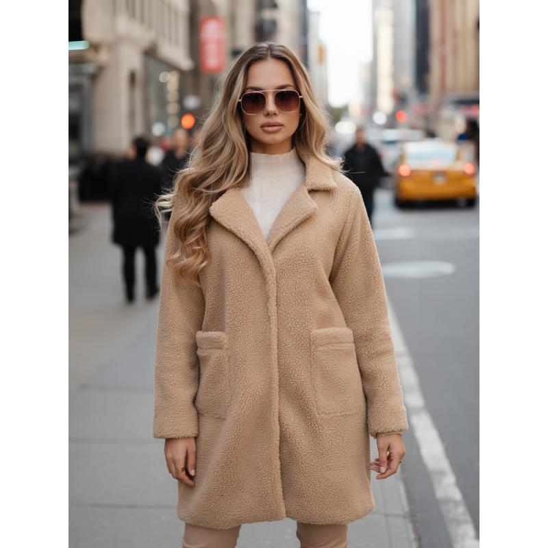 Dámsky zimný kabát s plyšovou kožušinou béžový z