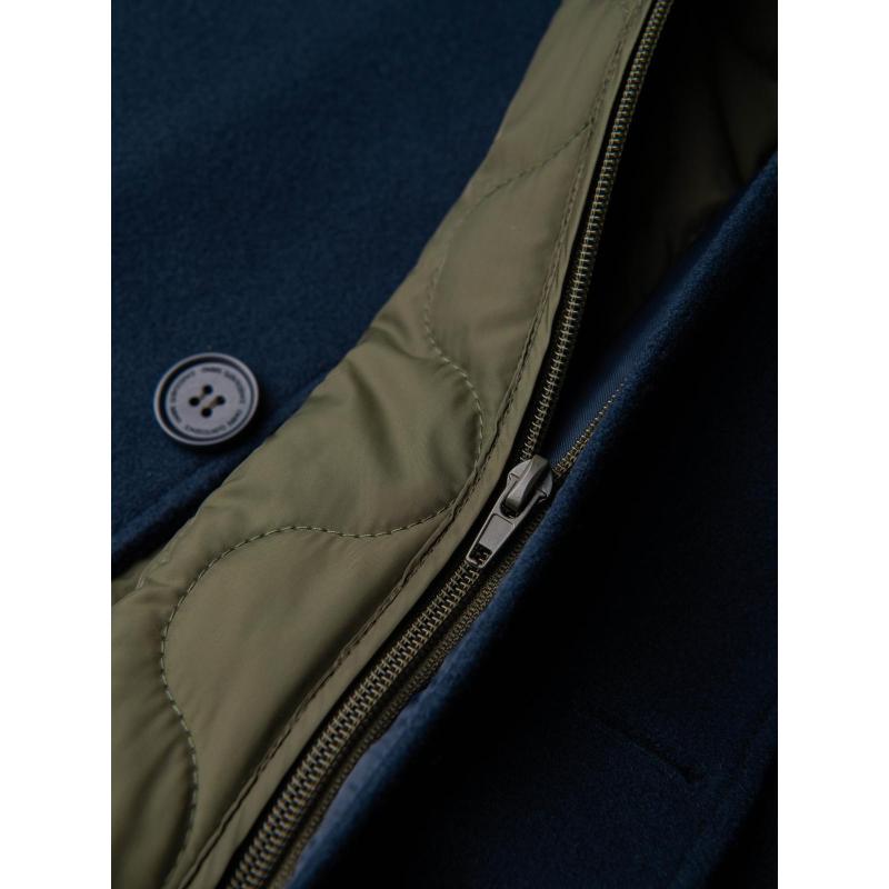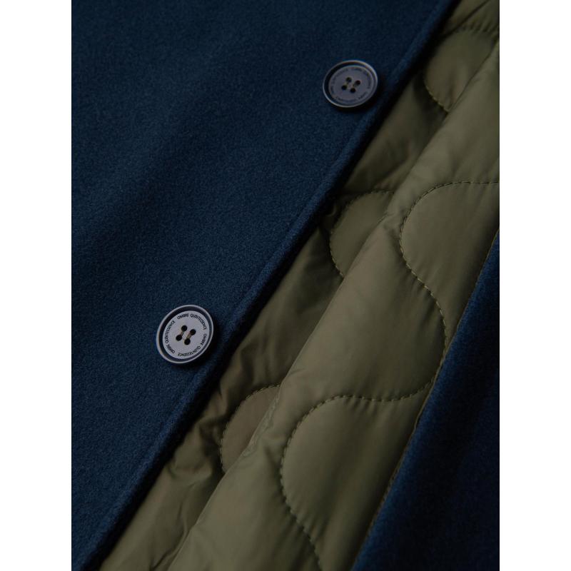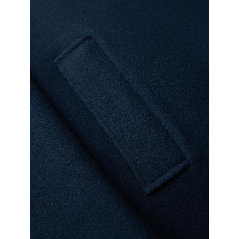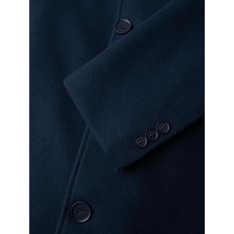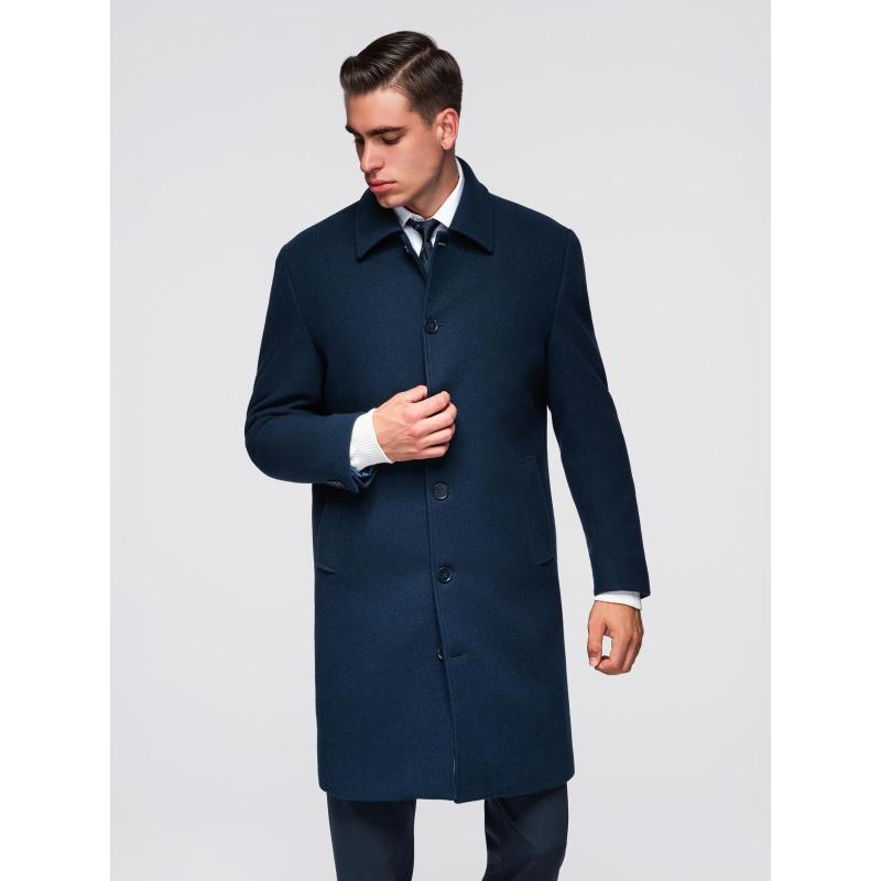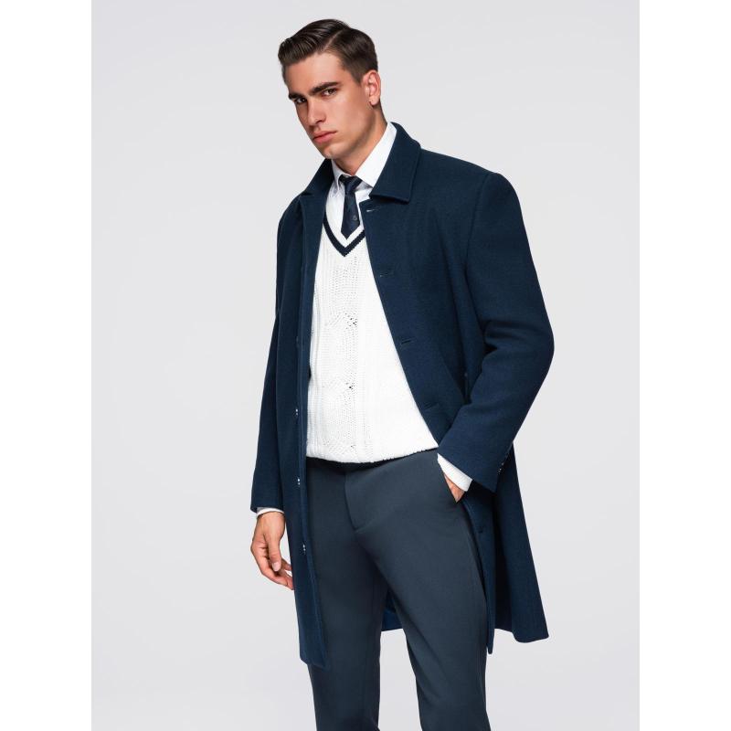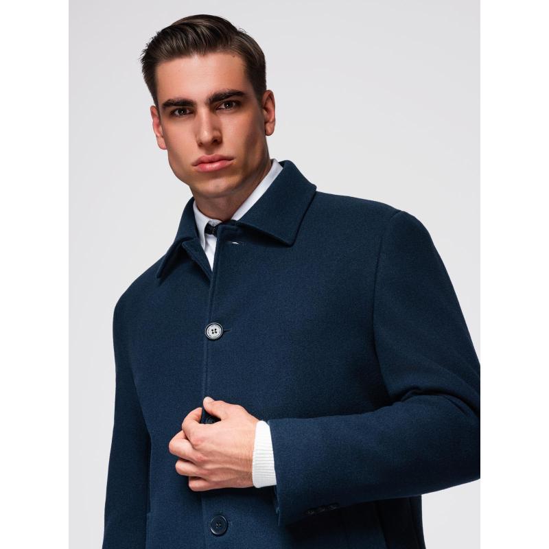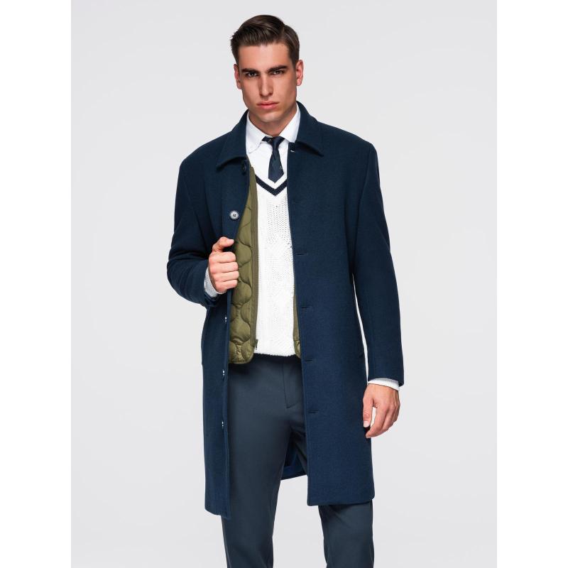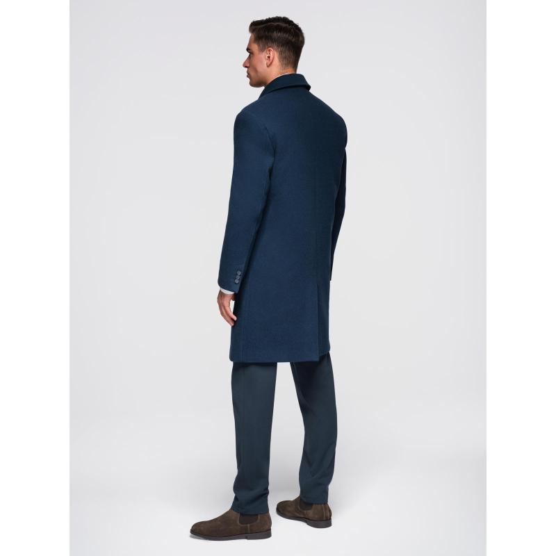 Dlhý pánsky jednořadový kabát s golierom a podšívkou – tmavomodrý V3 OM-COWC-0135