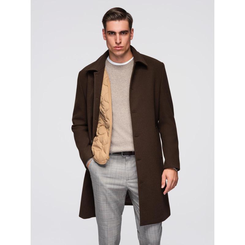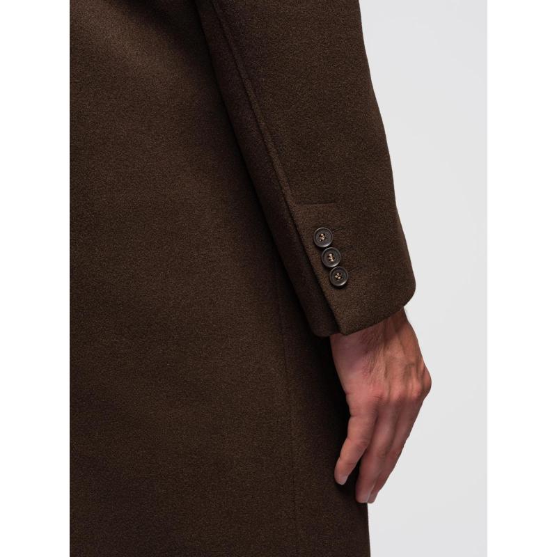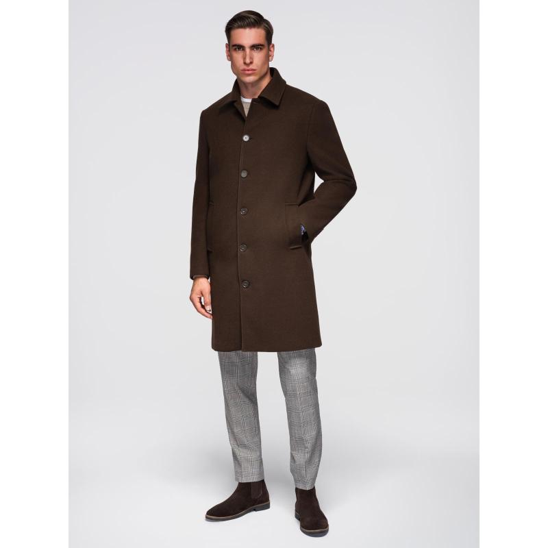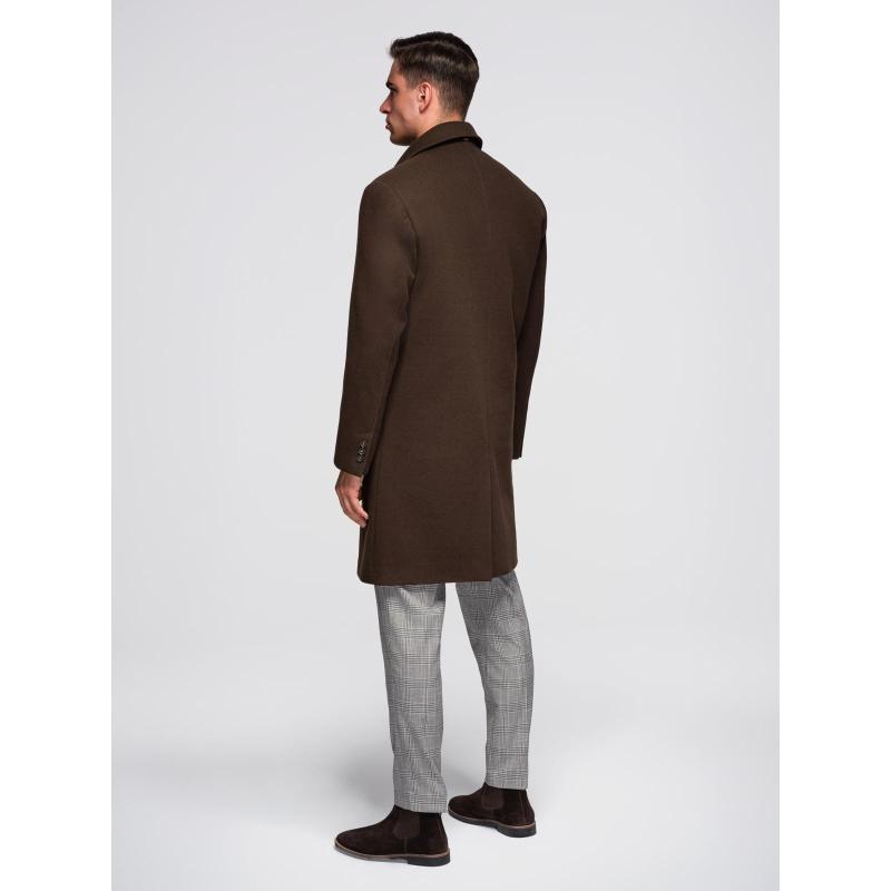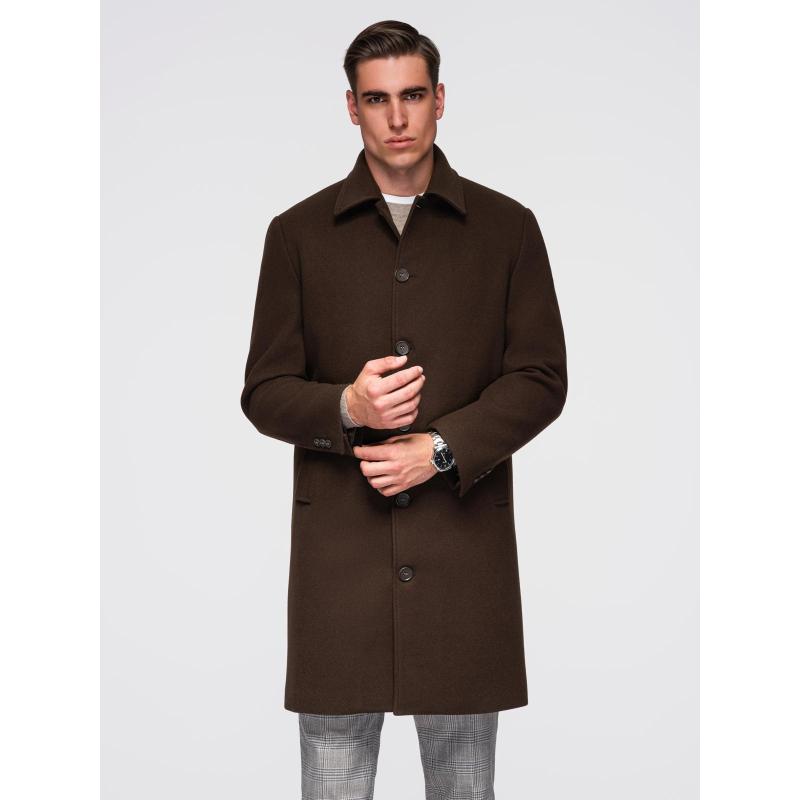 Jednořadový pánsky dlhý kabát s golierom a podšívkou – hnedý V4 OM-COWC-0135