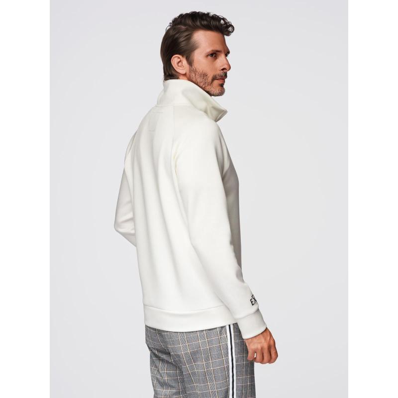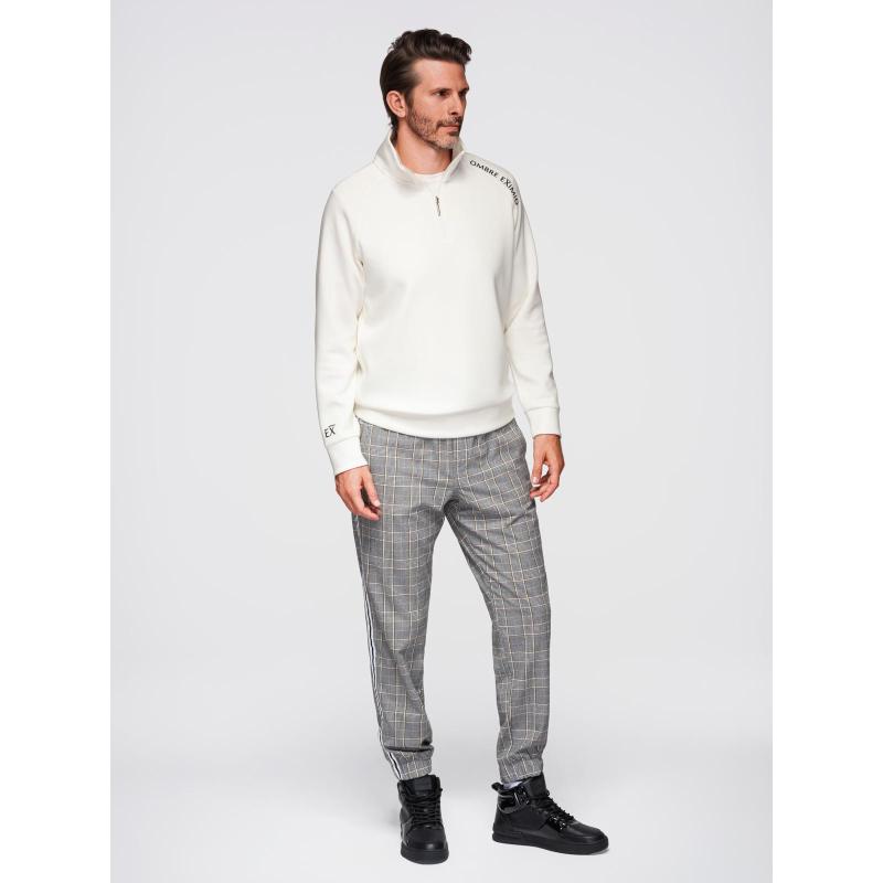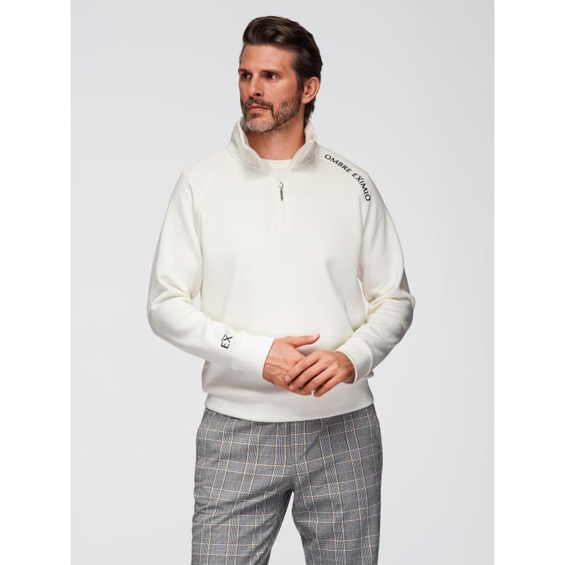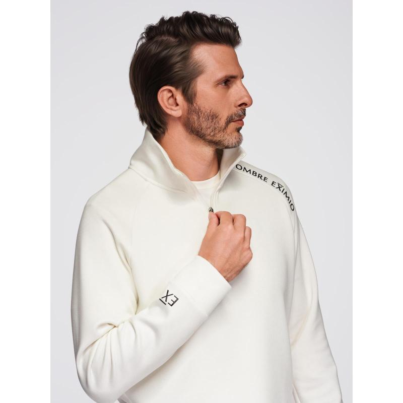 Pánska mikina s vysokým golierom bez gombíkov a kontrastným potlačou – ecru V2 OM-SSZP-0211