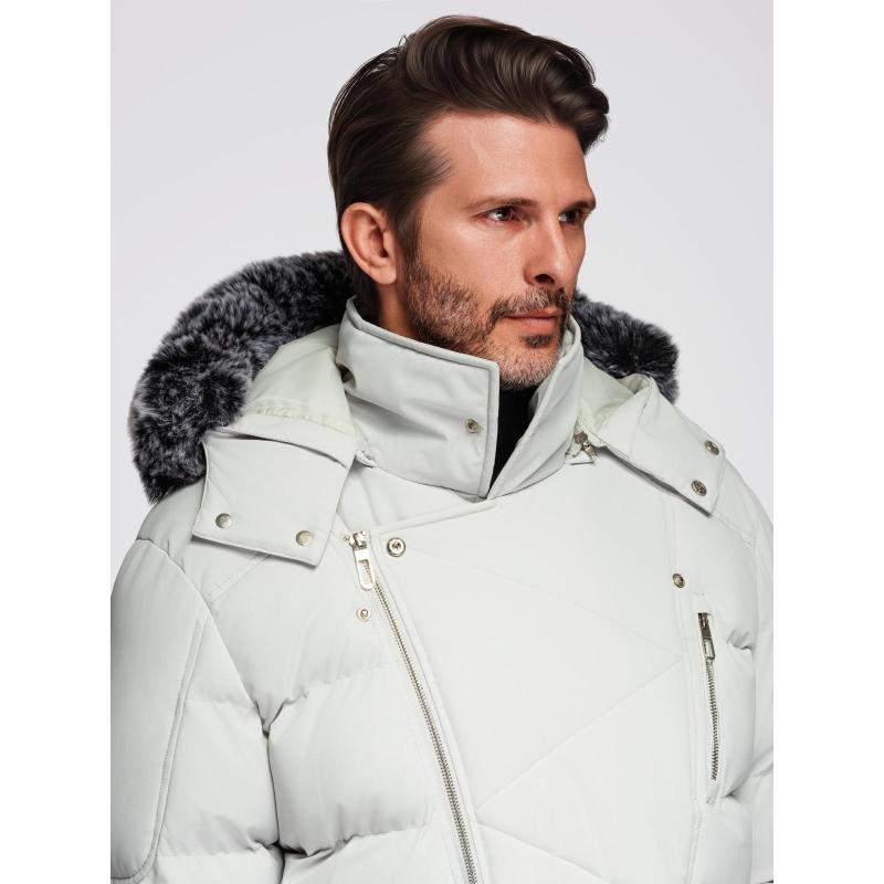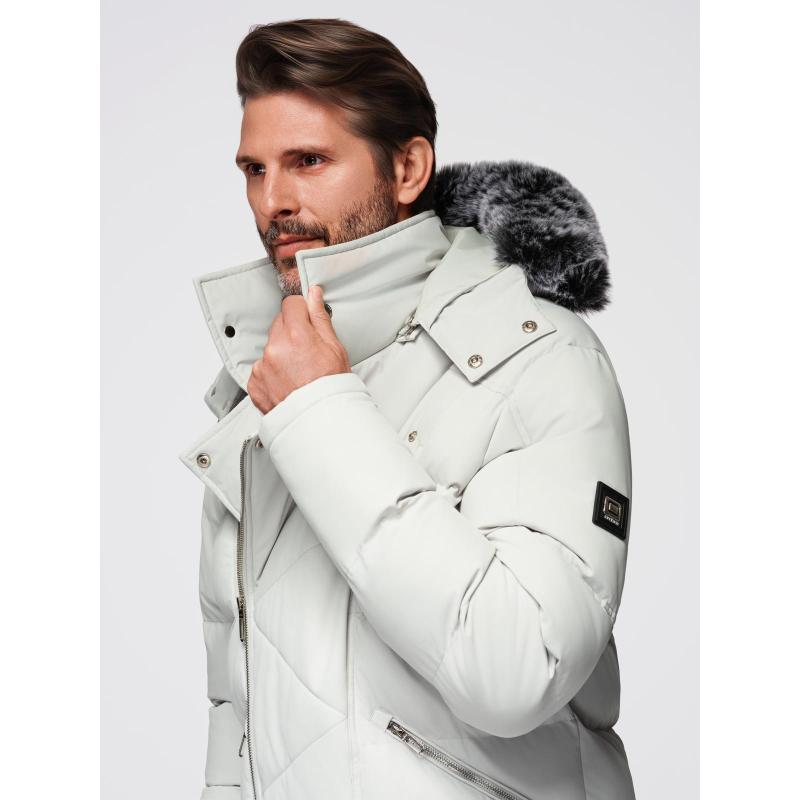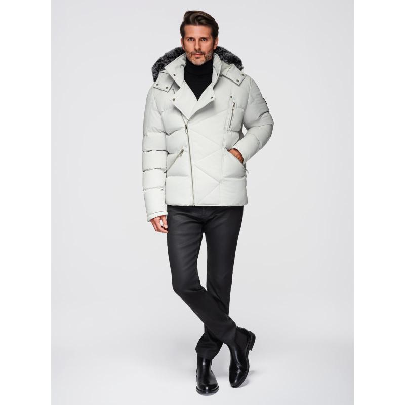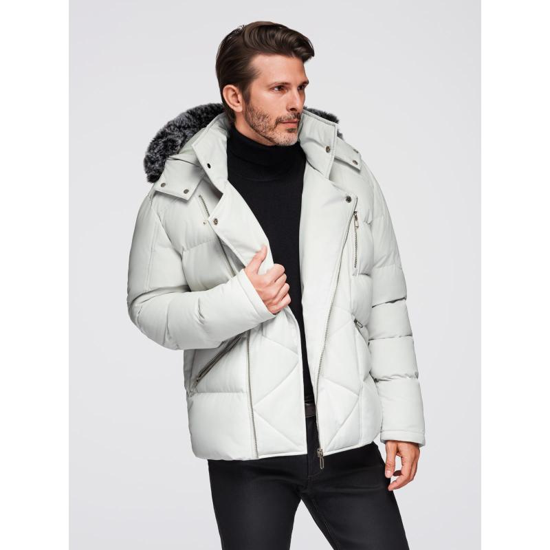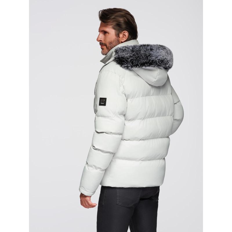 Pánska prešívaná bunda s výstrihom na ramenách a kapucňou – svetlo šedá V4 OM-JAHP-0252