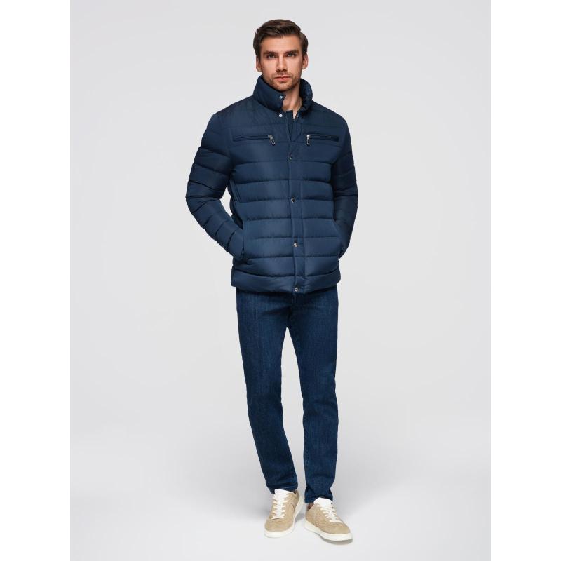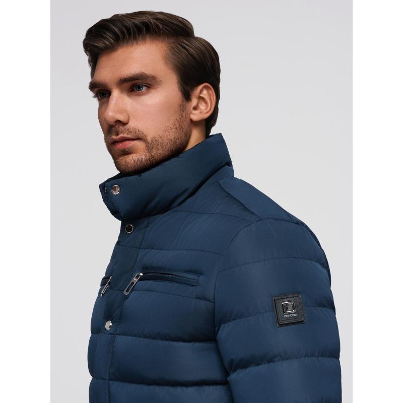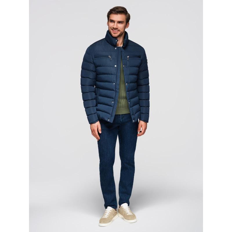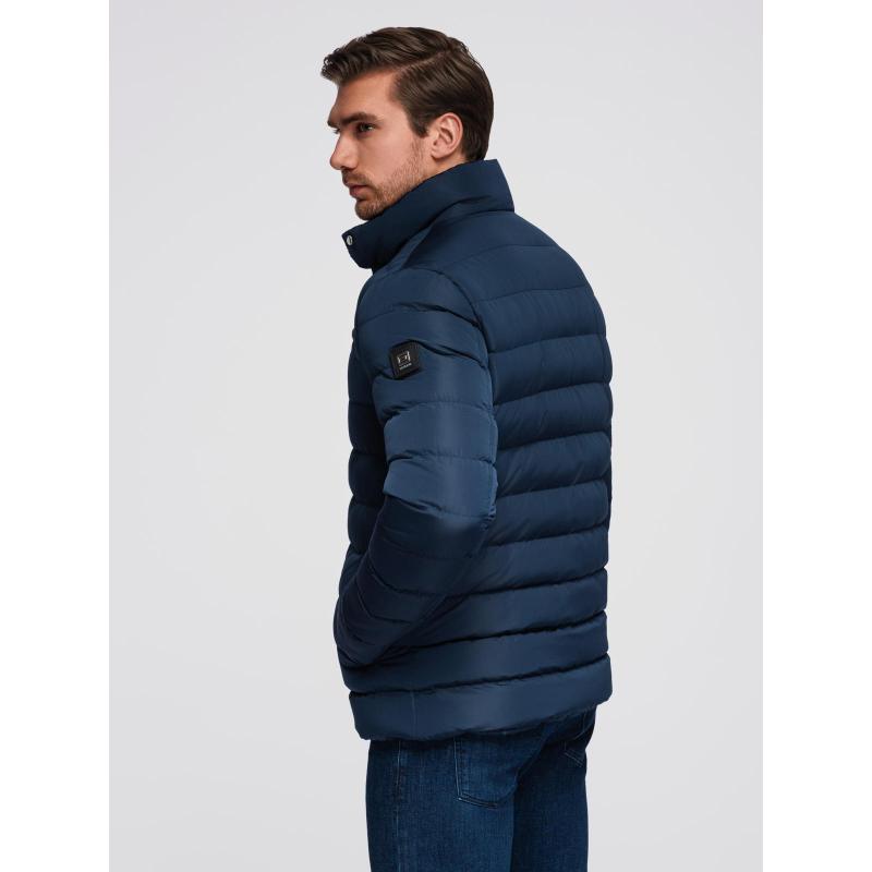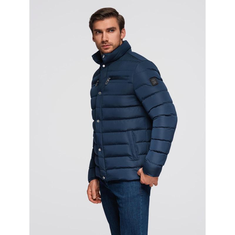 Pánska prešívaná bunda so stojatým golierom a zipsami na hrudi – tmavomodrá V2 OM-JALP-0260