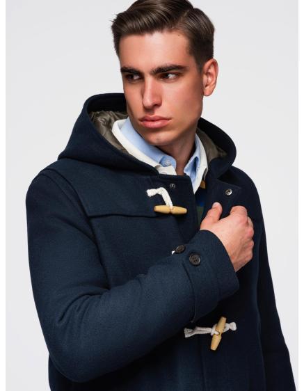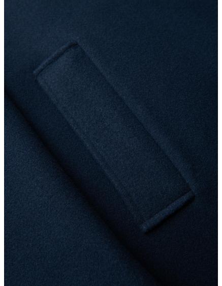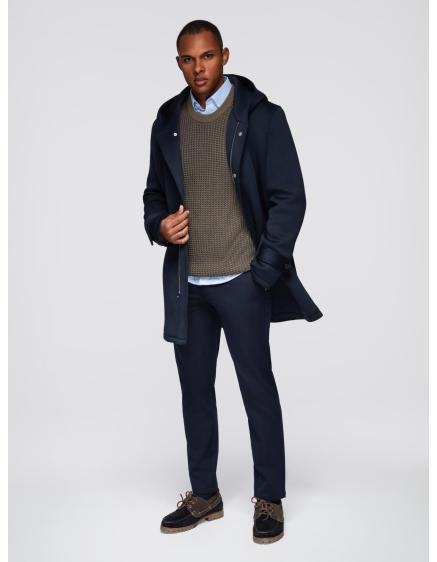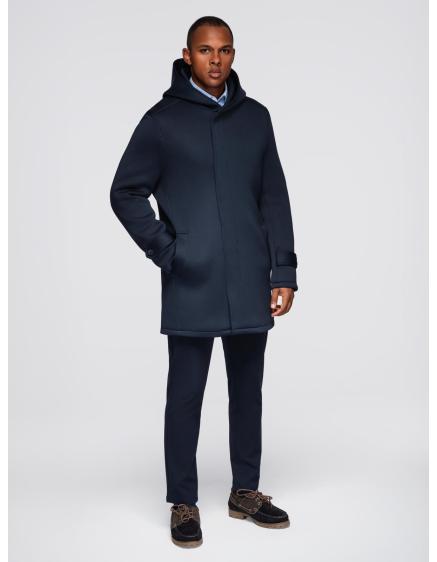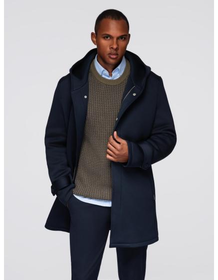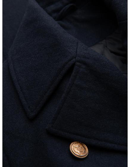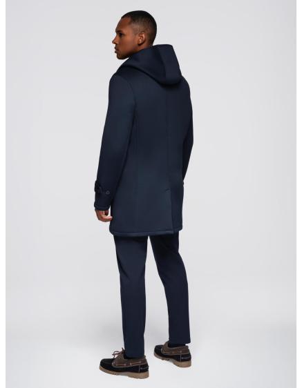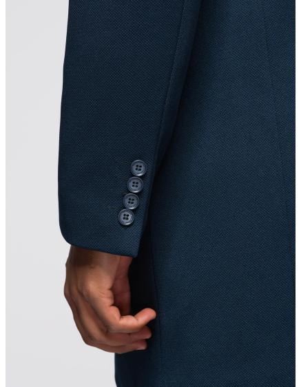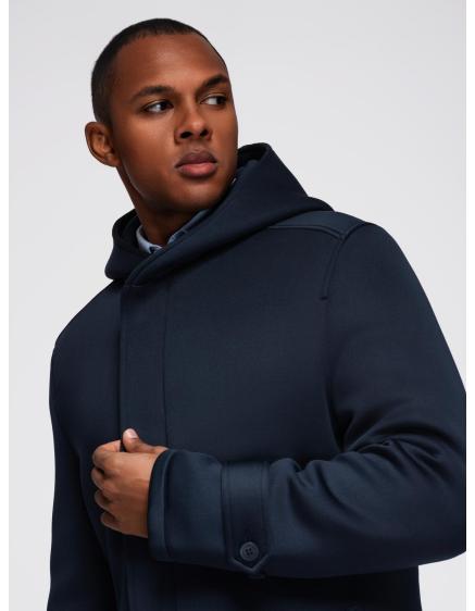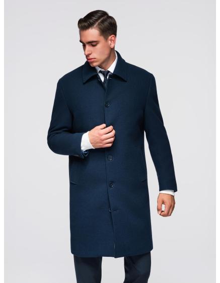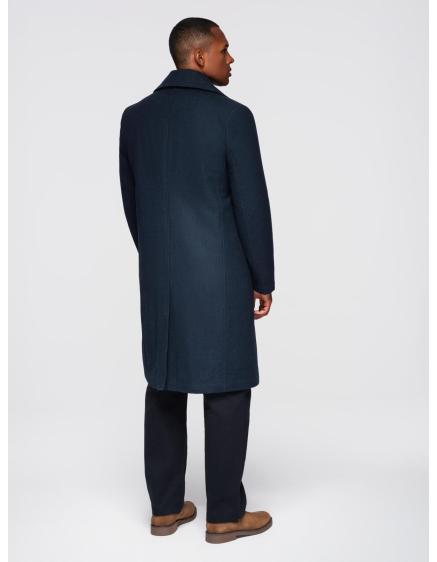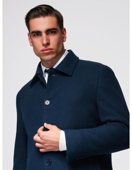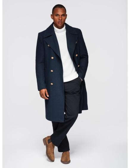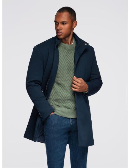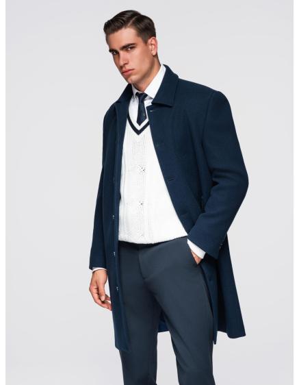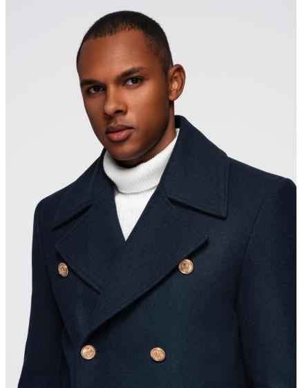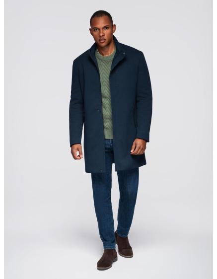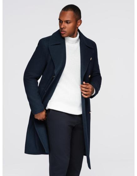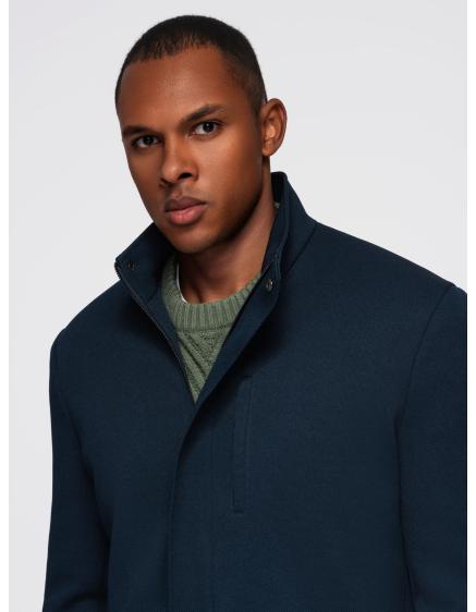 Pánsky kabát s asymetrickým zapínaním a vysokým golierom – tmavomodrý V3 OM-COWC-0141