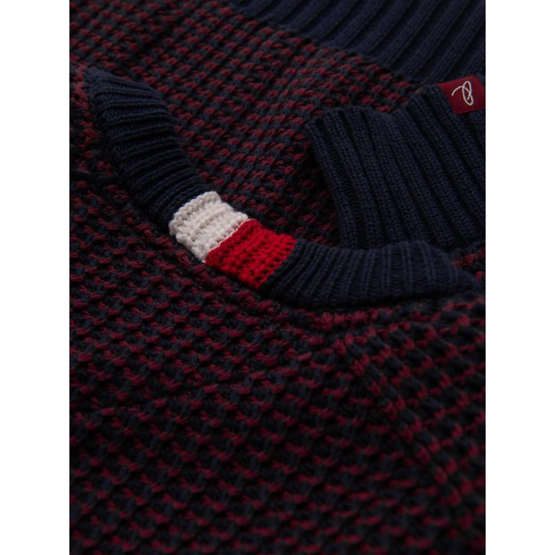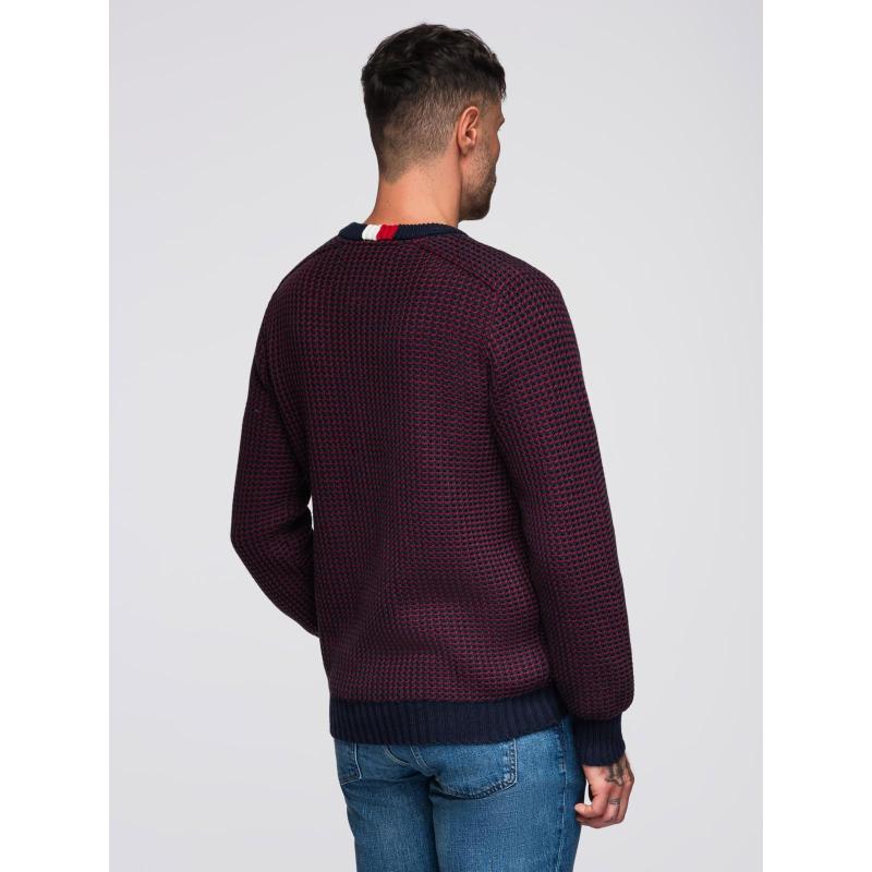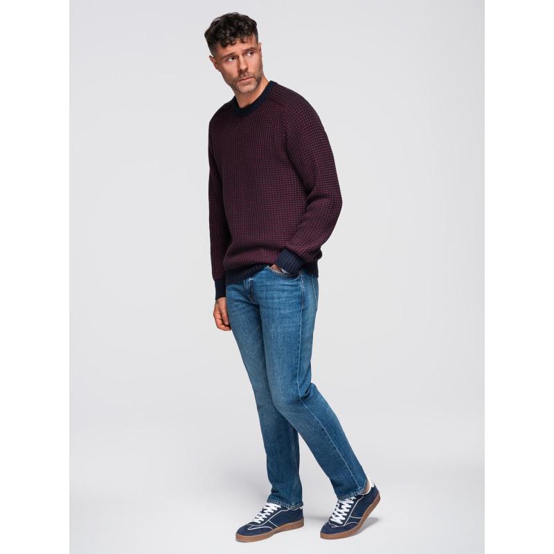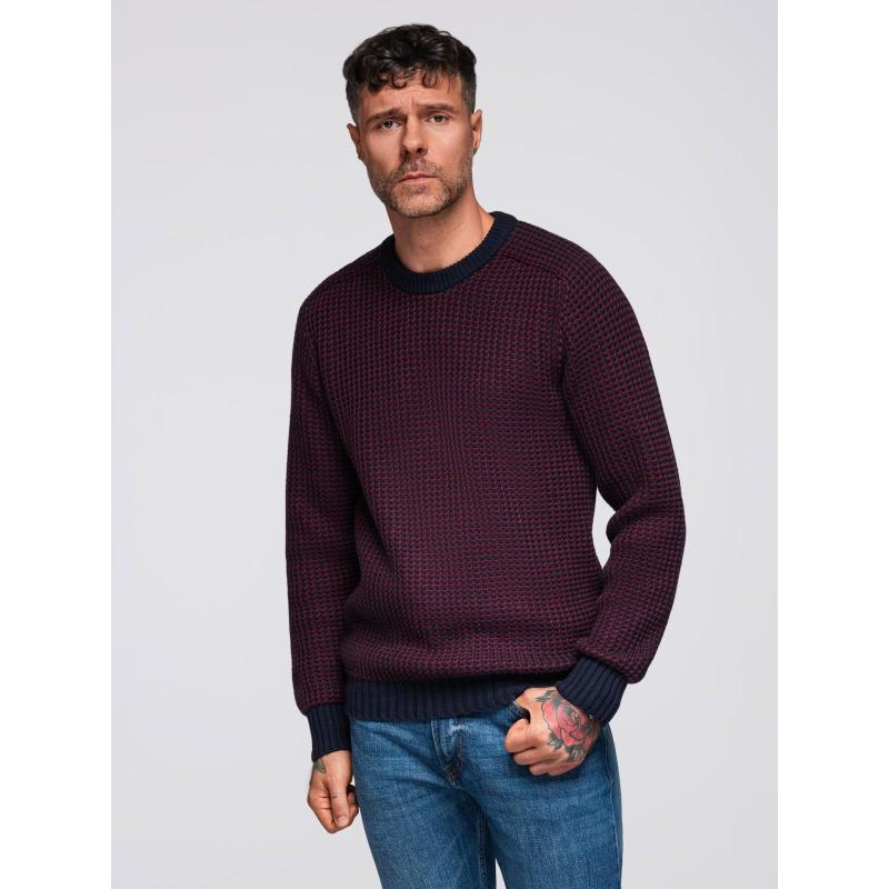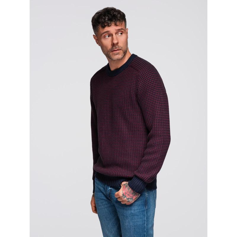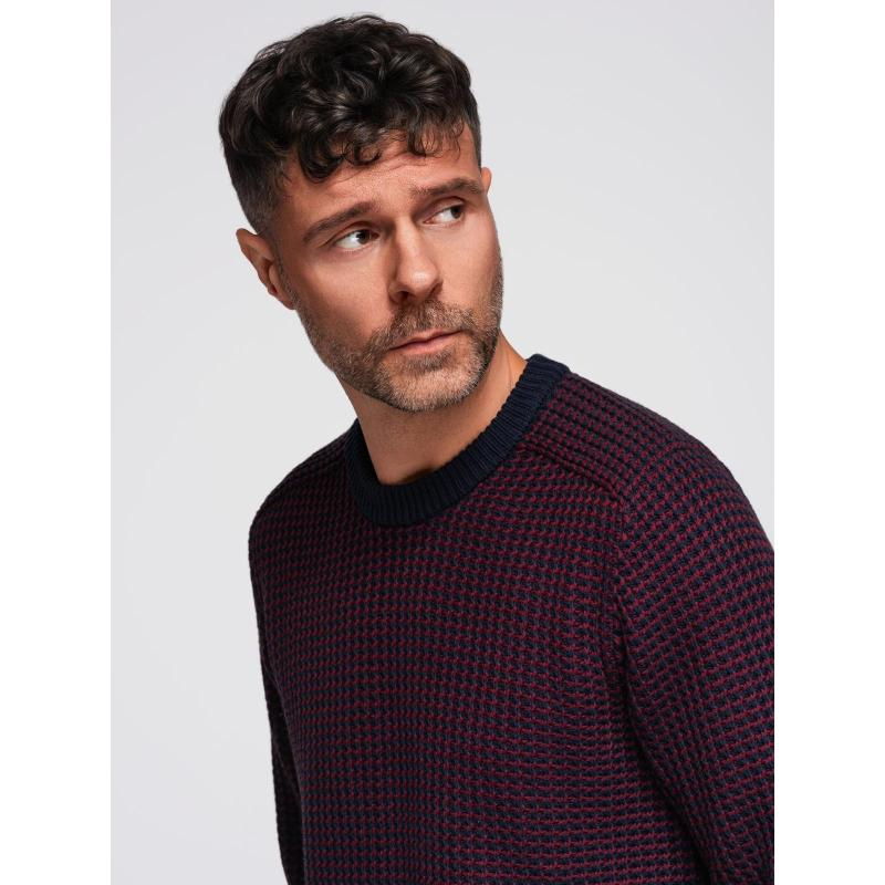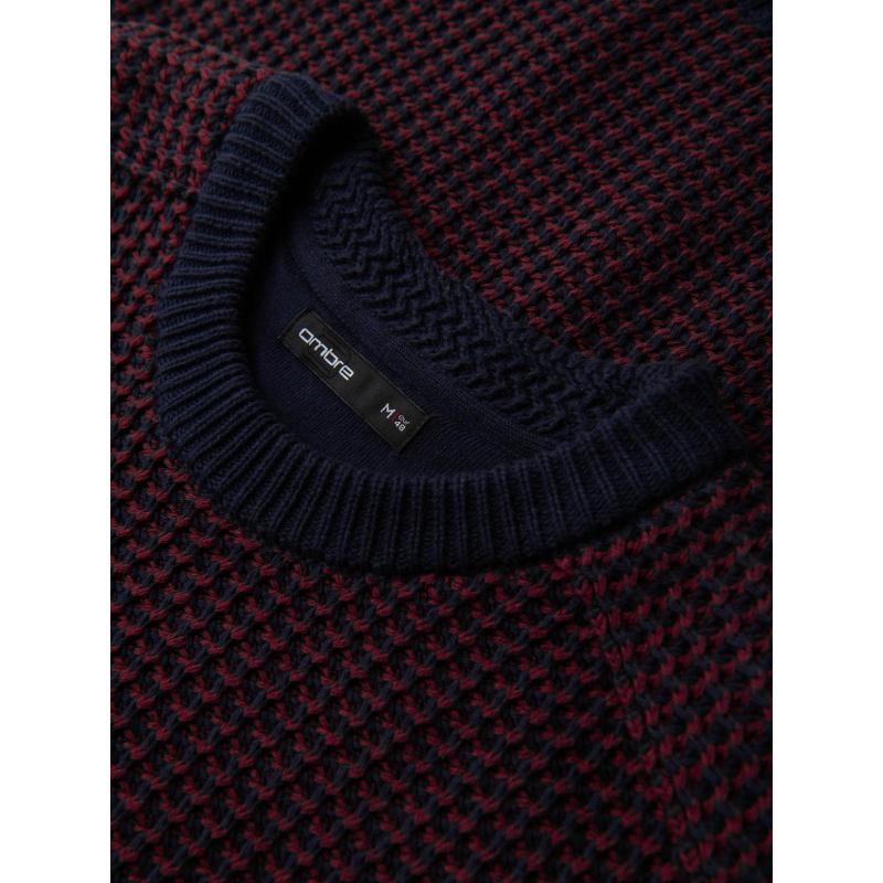Pánsky sveter s kontrastnou väzbou a okrúhlym výstrihom – gaštanovo hnedý V1 OM-SWSW-0122